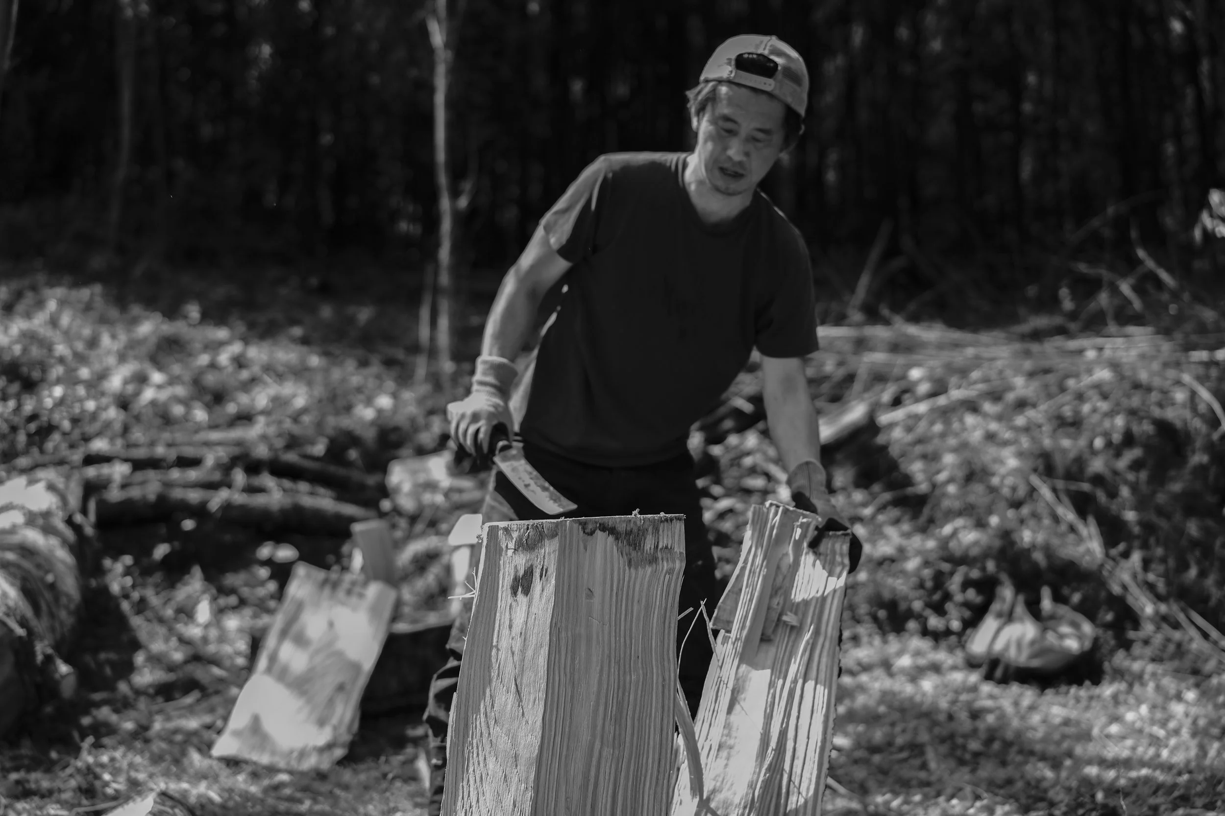 私の仕事は、漆(うるし)の木の命とともにあります。夏から晩秋にかけては漆(うるし)搔(か)き。樹皮を剝(は)ぎ、幹や枝に傷をつけて、樹液である漆を採ります。冬には漆を搔き終えた木々を切り倒し、それらに鉈(なた)をいれて作品の材とします。風雪に耐えた痕跡(こんせき)は、ひと割りするたびに木肌が一変し、ときに自分の思いを超える表情を見せてくれることがあるのです。その瞬間をとらえて、命ある形にしていきました。