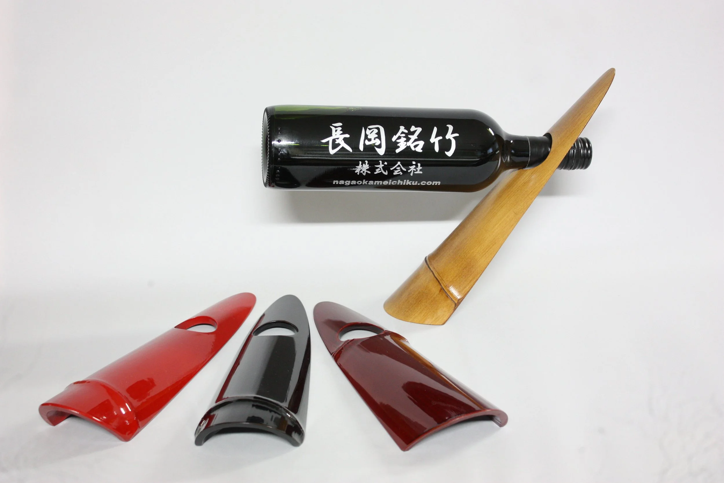 長岡長岡銘竹の三代目社長、真下彰宏氏は、横浜生まれの竹垣職人であり京もの認定工芸士。5歳の頃に京都府長岡京市へ移り住み、 「竹」と身近に育った。長岡銘竹株式会社三島一郎(京の名工)に師事し、竹垣製作に従事してきた。主な仕事に、桂離宮、京都迎賓館、 平安神宮、松花堂庭園などがある。氏の興味深いところは、それ以外にも幅広い活動をしている点で、諸外国で竹垣製作や実演・ワークショップをするなど、海外での竹工芸の普及を目指し、竹を使った様々なものを考案しているところにある。今回の力点をうまく使ったボトルスタンドは、コロンブスの卵的な発明に近い。海外で人気が出そうだと思う。