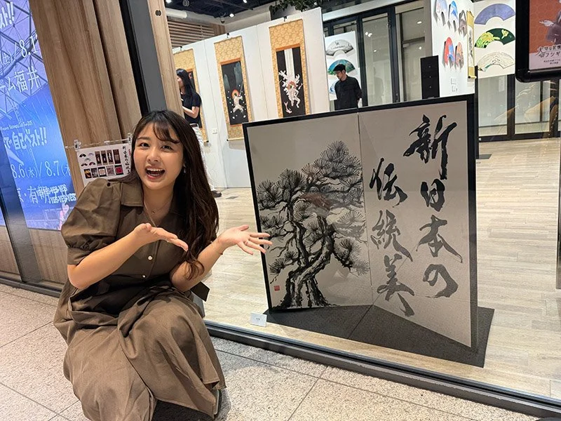 屏風に描かれた松は、古来より長寿や不変の象徴として敬われてきました。その力強い生命力に「新日本の伝統美」の書を重ね、伝統を受け継ぎながらも新たな美を創造していく姿を表現しています。墨と水だけを用い、幹や枝には濃淡やにじみを生かして自然の息づかいを映しました。単純でありながら奥深い墨は、余白と響き合い、静けさの中に無限の広がりを生み出します。未来へと続く日本美の精神を映す一作です。