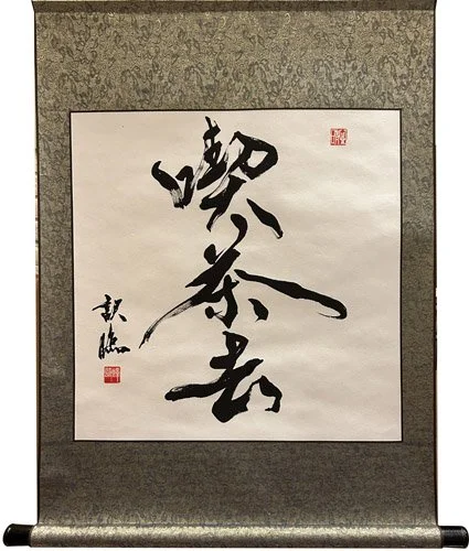 禅の言葉「喫茶去」には、「お茶でも飲んで、この瞬間を大切に」という心が込められています。日常の何気ない一杯のお茶にも、深い悟りや智慧が宿り、誰もが分け隔てなく、今を素直に味わう心を表しています。本作はその精神をしなやかな筆致で表現し、掛ける空間に和やかな気配を添えて、日々の中で心を解きほぐし、安らぎと前向きな力を灯す一作です。