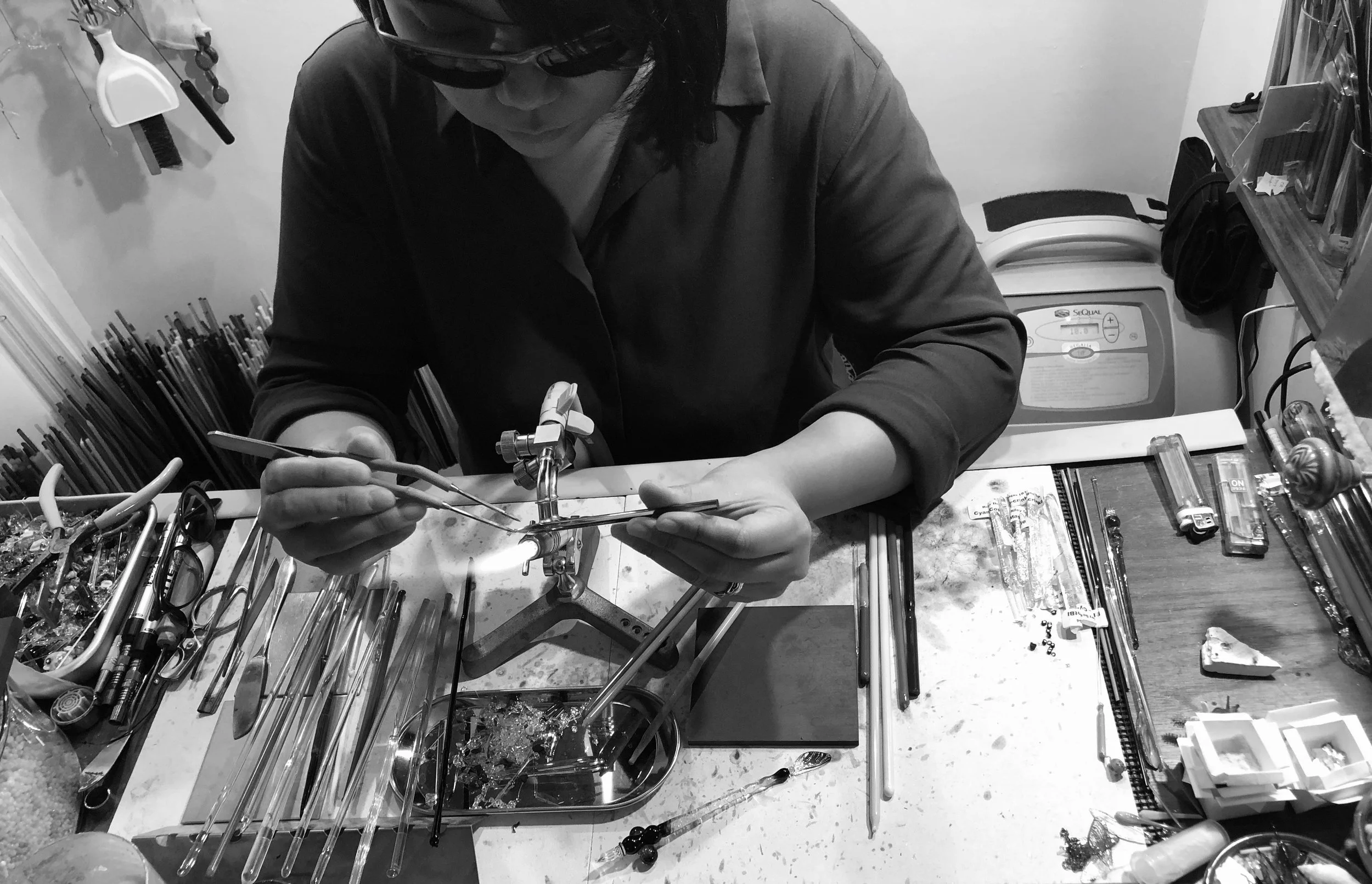 パーナーワークという技法でイタリアのガラスを使用し、ほぼ実物代の昆虫作品を制作しています。